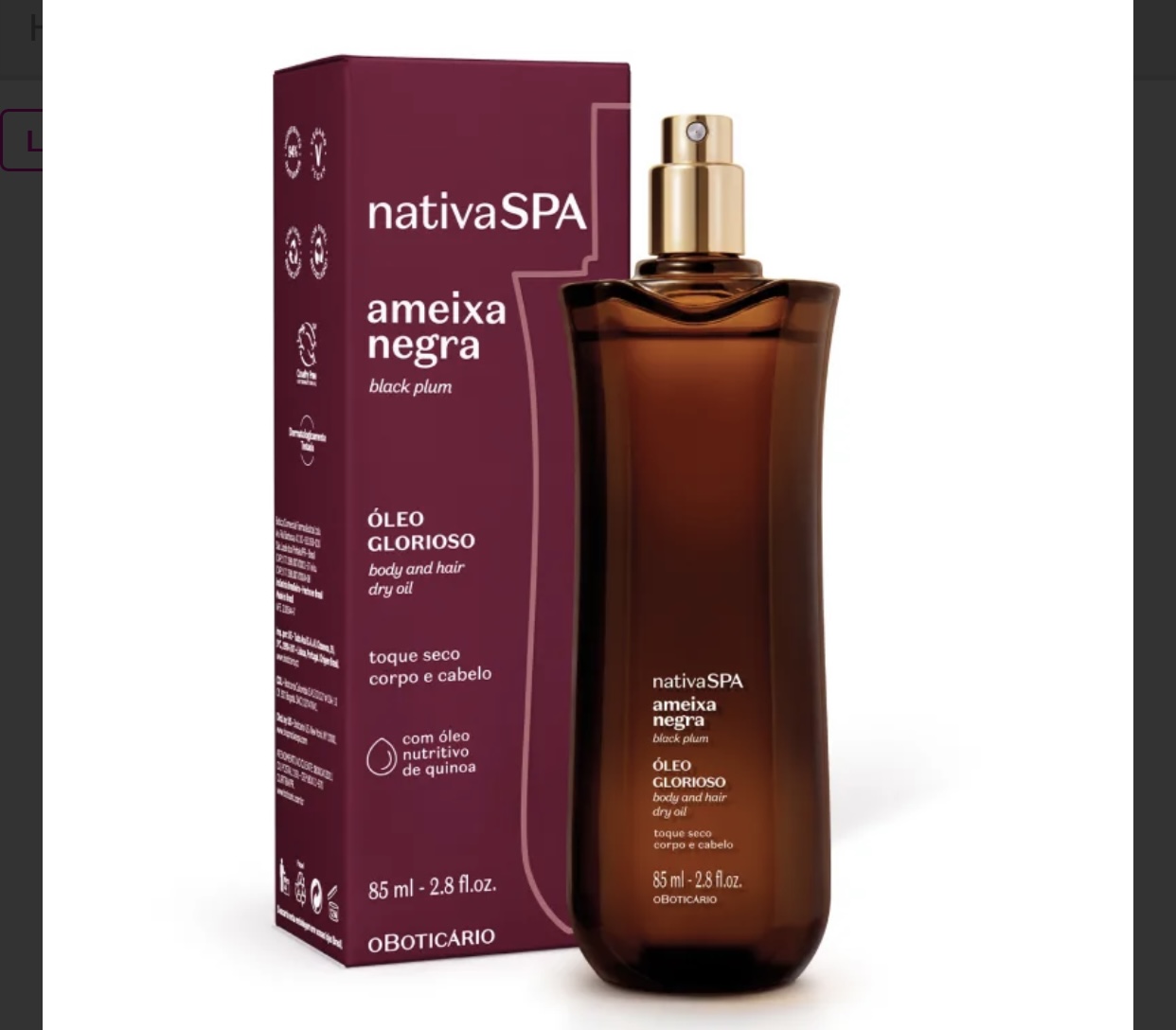 Óleo Corporal Óleo Multifuncional Glorioso Nativa SPA Ameixa Negra 85ml R$ 142,90 O preço original era: R$ 142,90.R$ 98,90O preço atual é: R$ 98,90. Adicionar ao carrinho