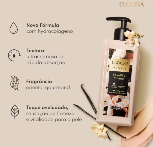 O Creme Hidratante Desodorante Corporal Instance Baunilha Intensa possui textura cremosa, perfumação intensa e até 48 horas de hidratação profunda**, trazendo uma fragrância oriental gourmand envolvente e marcante: a baunilha de Instance combinada com notas amadeiradas sofisticadas