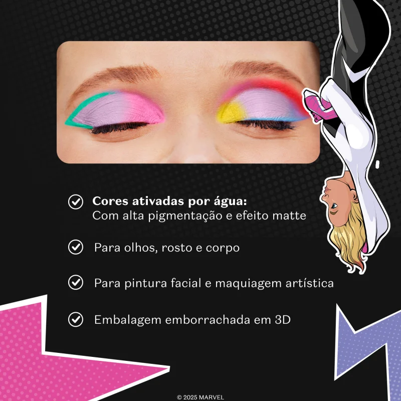 Em edição limitada, é uma ótima opção de maquiagem infantil em um presente para criança super estiloso!  Pegue carona nos poderes de camuflagem da Spider-Gwen ou na energia bioluminescente do Spider-Man do Brooklyn e crie a maquiagem ideal de heroína desse mundo e de todos os outros.