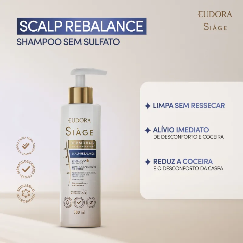 O Shampoo Siàge Dermo Hair Scalp Rebalance oferece uma solução completa para um couro cabeludo saudável e livre de caspa. A fórmula deste shampoo anticaspa possui Ácido Mandélico e Scalp Balance, tecnologia prebiótica e probiótica, e age de forma multidimensional, combatendo a caspa, a oleosidade, a sensibilidade, a coceira e a descamação desde a primeira lavagem.